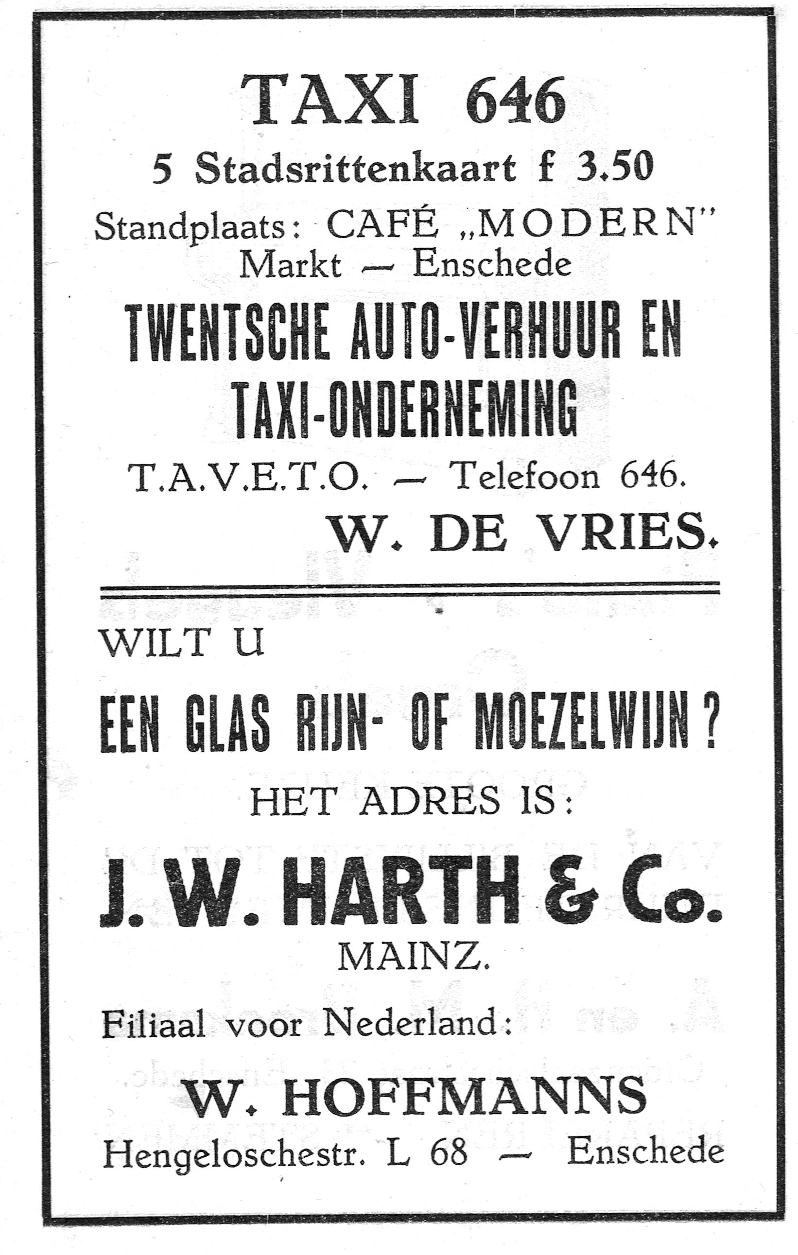 Markt Twentsch Auto-Verhuur Tax-Onderneming taveto standplaats Cafe Modern advertentie 1931.