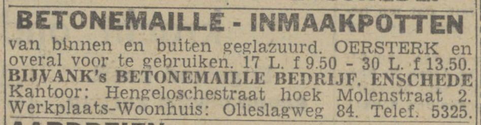 Molenstraat 2 hoek Hengelosestraat Bijvank's Betonemaille Bedrijf advertentie 9-10-1943.
