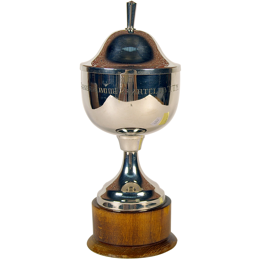 Prijsbokaal van een Kaarttoernooi van de TETEM. Deze voormalige dekenfabriek werd in 1915 als de N.V. Twentsche Textiel Maatschappij ‘Tetem’ opgericht aan de Stroinksbleekweg te Enschede.