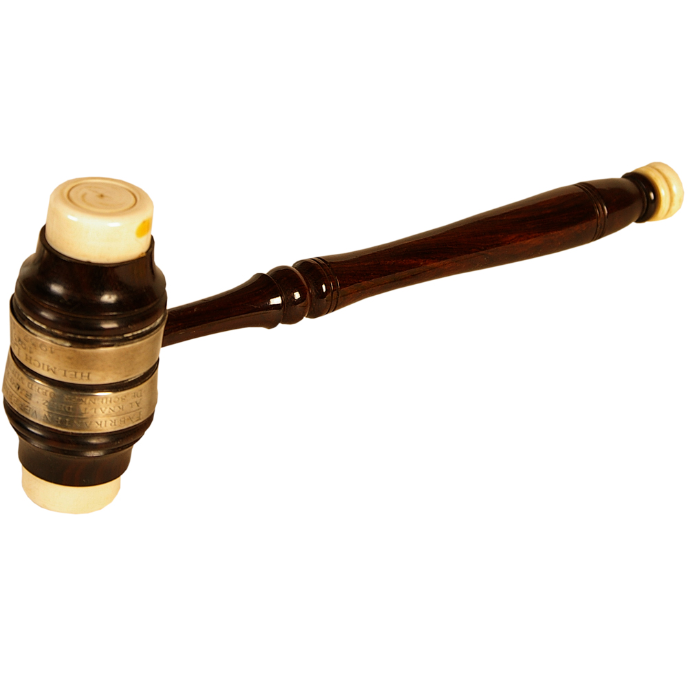 Voorzittershamer van de in 1888 opgerichtte Fabrikanten Vereniging Enschede. Op de hamer de tekst Al knalt deez hamer als de donder, de schenker deed vijftien jaar zonder, Helmich Ledeboer 1933, 1937-
