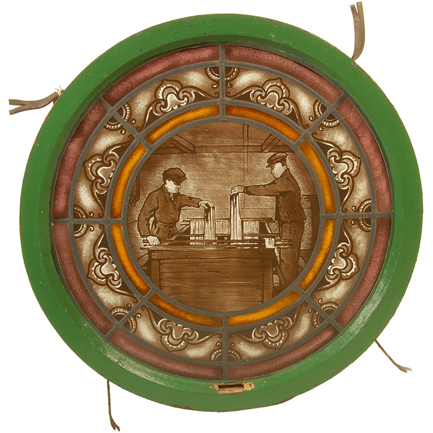 Glas-in-lood raam met gebrandschilderde afbeelding van een 17de eeuws interieur met weefgetouw (smietspoel). Afkomstig van textielfabriek van Heek & Co. in Enschede.