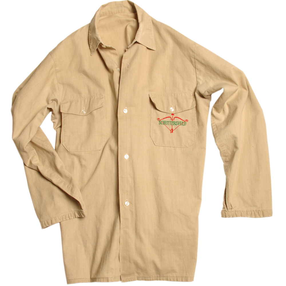 Werkjas afkomstig uit textielfabriek Schuttersveld van Gebr. van Heek in Enschede. fabriek Gebr Van Heek in 1859 gevestigd op het Schuttersveld, tot dan het landgoed van Charles De Maere.