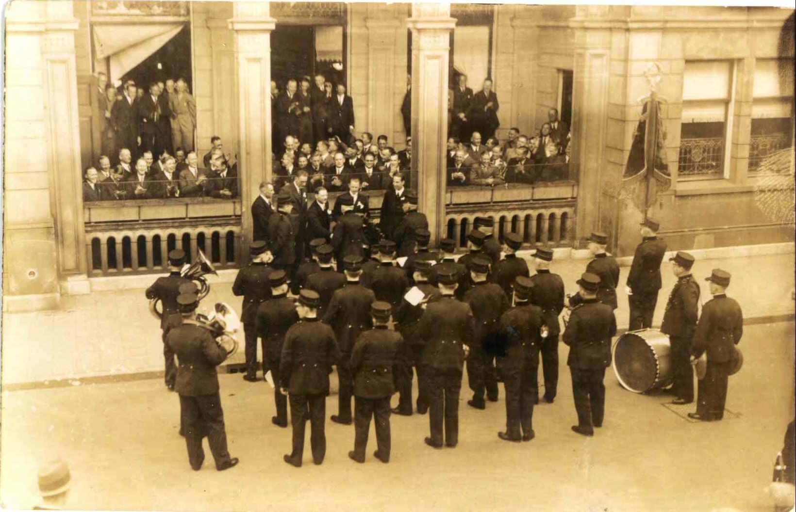 Langestraat 1934-1939 De Koninklijke Enschedese Burgerharmonie geeft een serenade op en voor het terras van de Groote Sociëteit..jpg