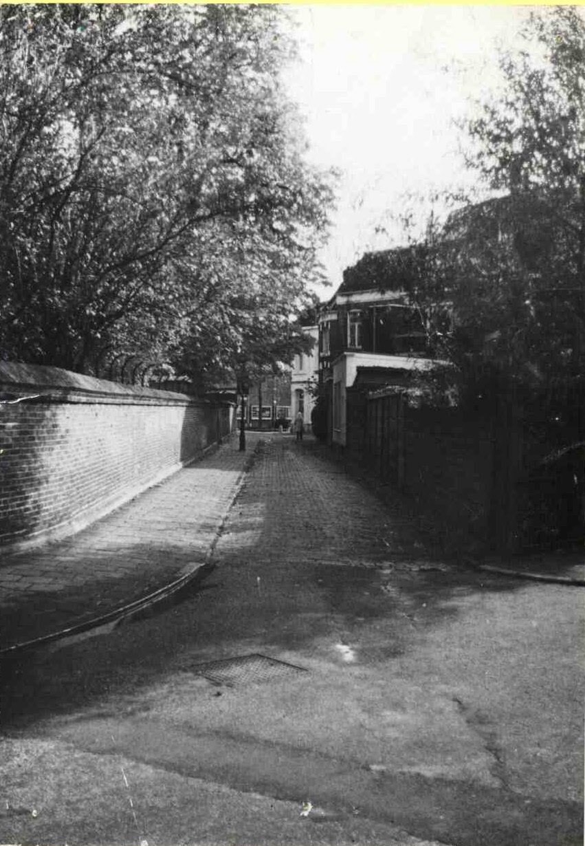 Brinkgaarden n oostelijke richting gezien vanuit de Kloosterstraat. Links de muur om de tuin van het Larinksticht. 27-3-1970.jpg