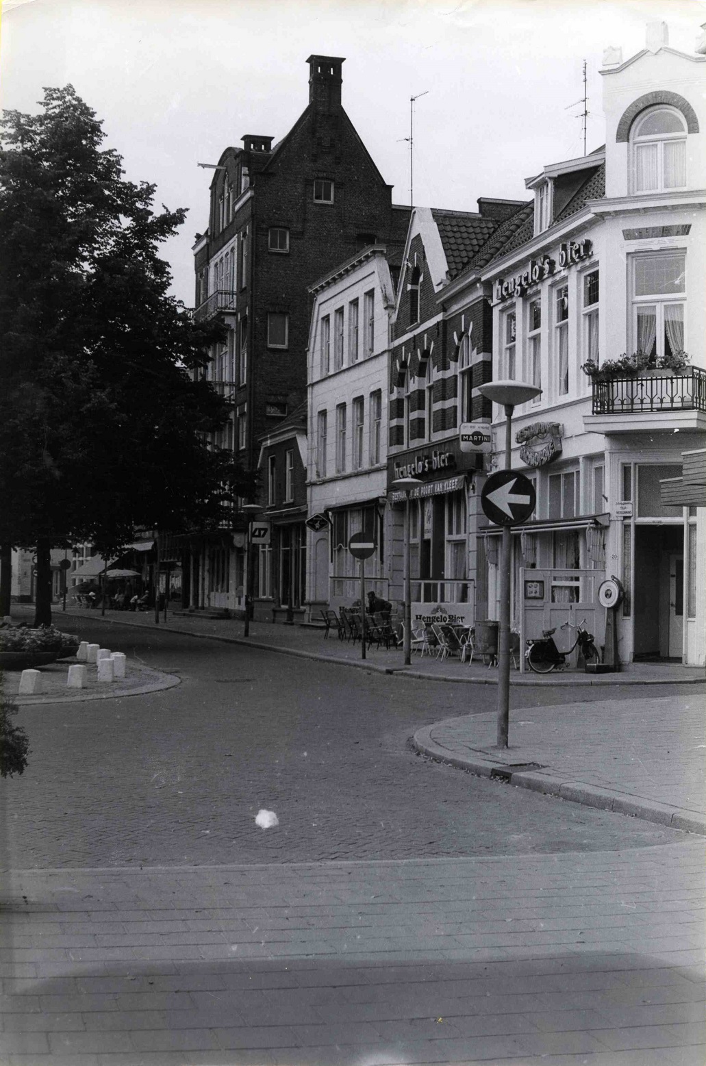Markt 18 Zicht op terras en cafe's Poort van Kleef en Cockney's aan de oostzijde, Markt 17. 1975.jpg