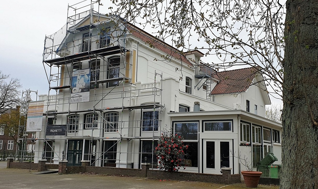 Het pand in de steiger voor de renovatie en de monumentstatus (2021)