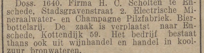 Scholten H.C. mineraalwaterfabriek, bierbottelaar Kottendijk 59 krantenbericht 11-4-1925 en 14-2-1940 advertentie 29-12-1930 en 17-7-1933