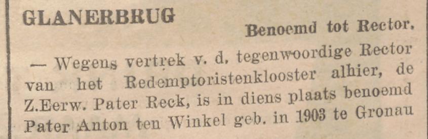 Redemptoristenklooster A.Jos.M. ten Winkel Rector Rijksweg 2 later Gronausestraat 1361-1363 krantenbericht 8-4-1936 24-4-1951 en 31-7-1959