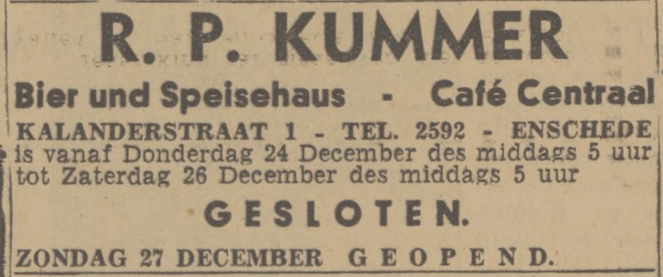 Kummer R.P. caféhouder "Café Centraal" Kalanderstraat 1 advertentie 24-12-1942