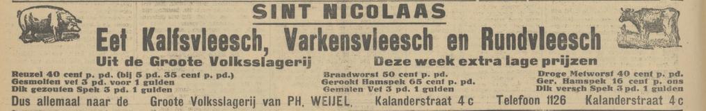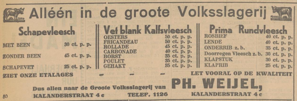 Weijel Ph. slagerij Kalanderstraat 4c advertentie 1-12-1930 advertentie 1-12-1930 en 8-5-1932