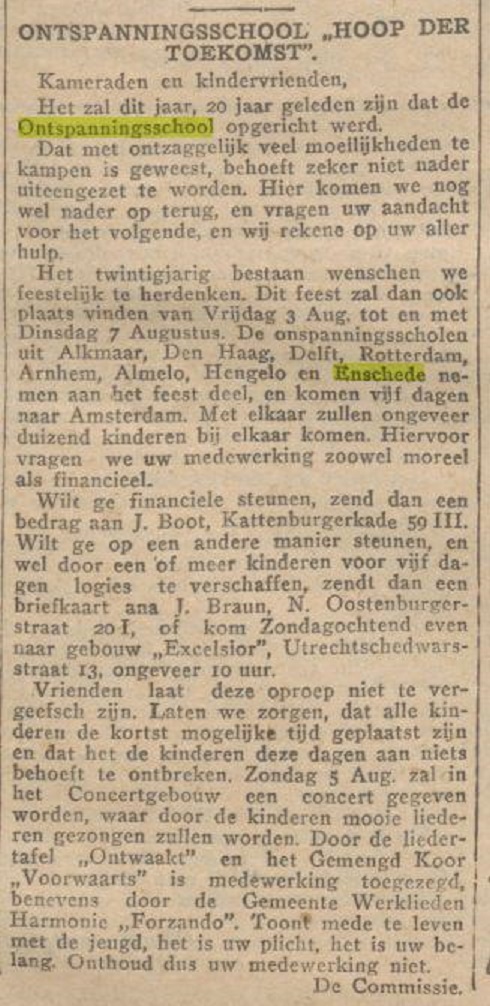 Kinderkoor De Jonge Proletaar advertentie Tubantia 5-8-1926