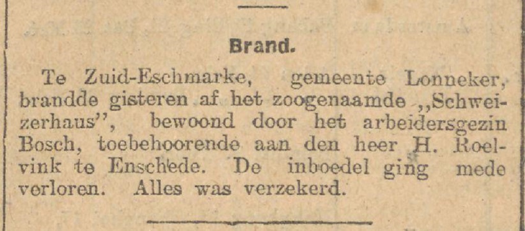 Het Schweizerhaus is later afgebrand zoals in onderstaand krantenbericht van 7-2-1913 blijkt.