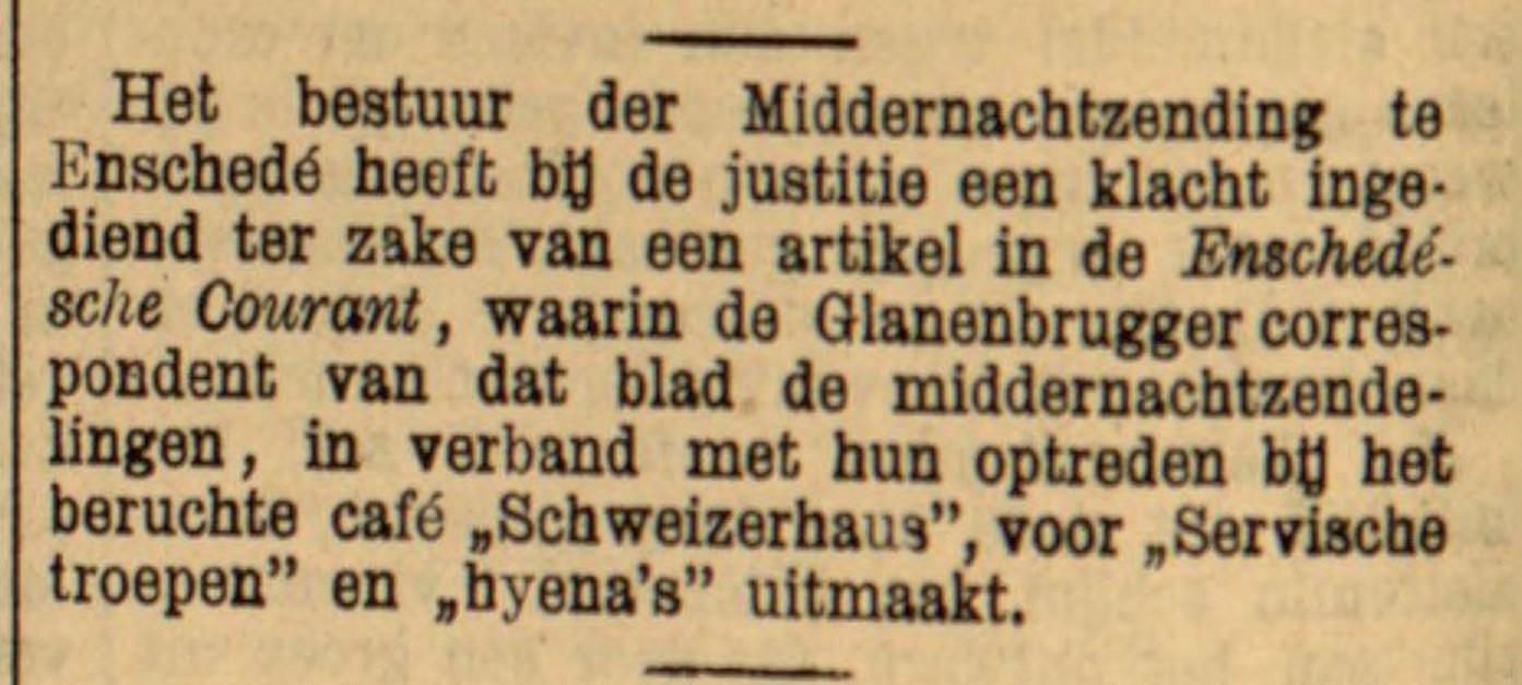 Dit beruchte cafe Het Schweizerhaus met damesbediening stond dus aan de Gronauschen straatweg (later Gronausestraat) zoals uit onderstaande krantenberichten blijkt.