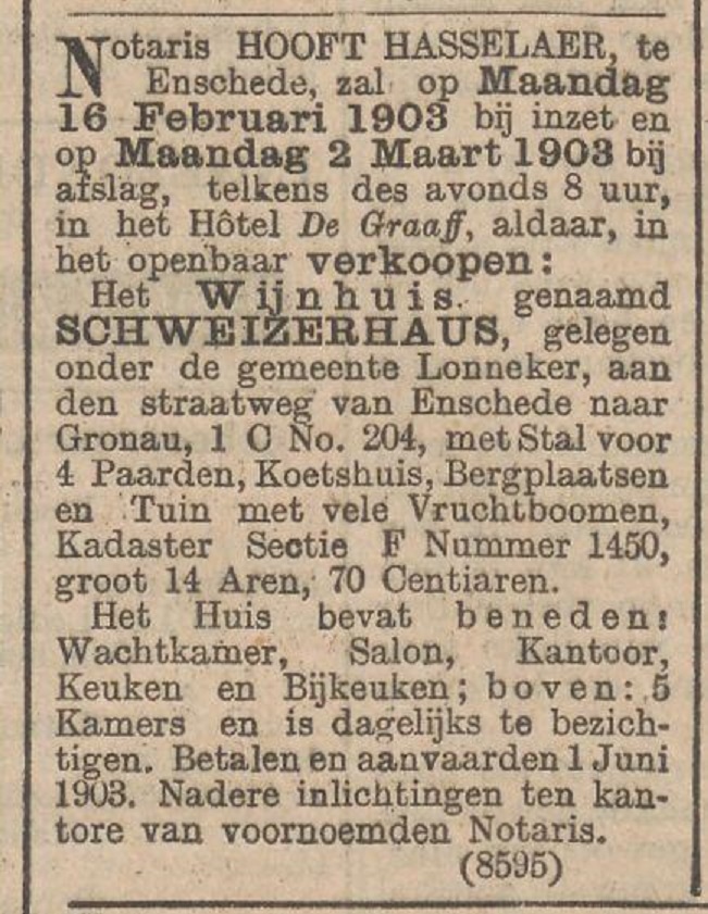 Schweizerhauis Wijnhuis aan de straatweg Enschede-Gronau, 1 C No. 204 advertentie 6-2-1903.