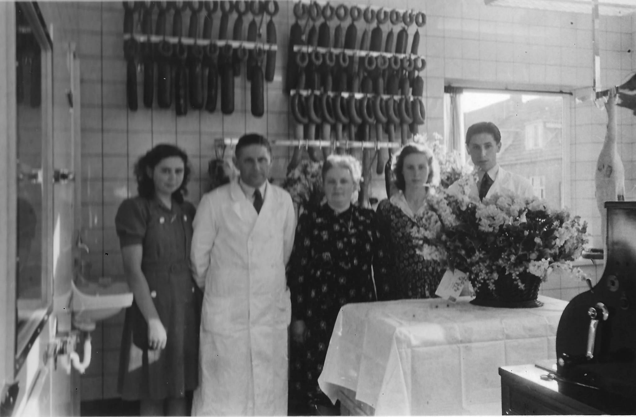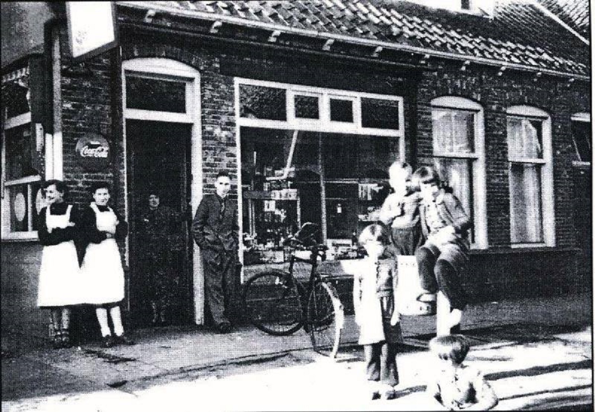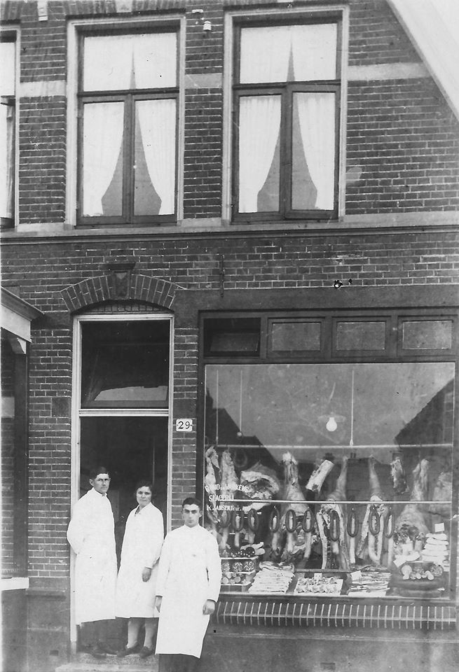 Links met de fiets voor de winkel is Slagerij Schildkamp