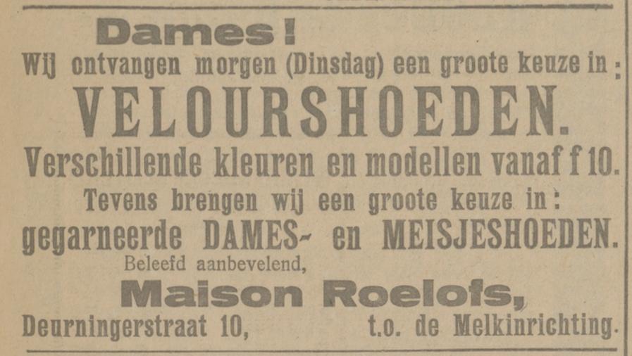 Deurningerstraat 10 Maison Roelofs dameshoeden advertentie Tubantia 17-10-1921.
