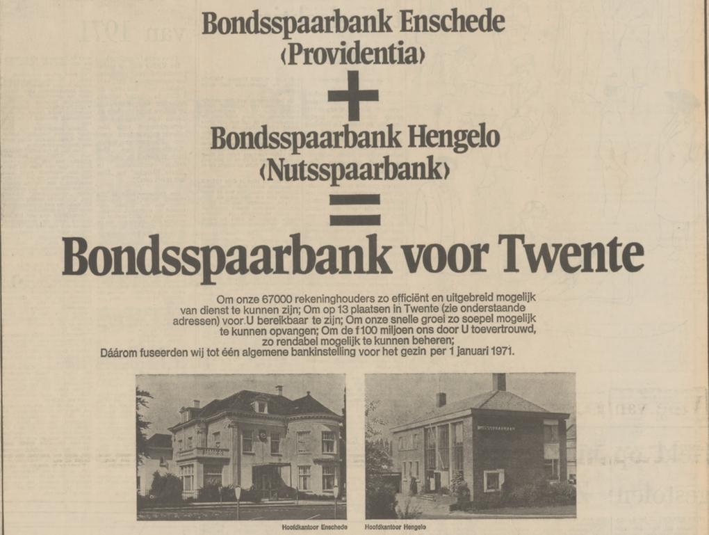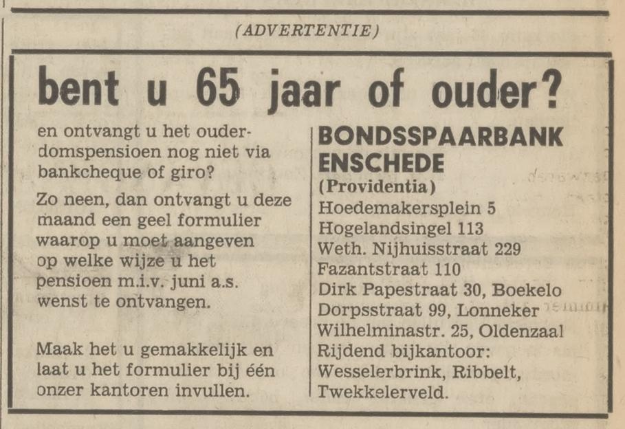 Wethouder Nijhuisstraat 229 Bondsspaarbank Enschede Providentia advertentie Tubantia 17-3-1970