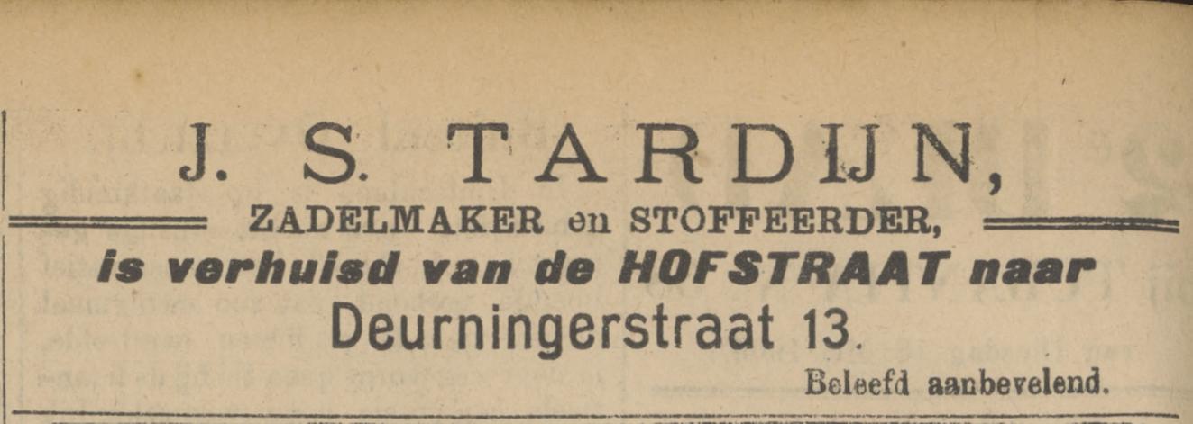 Deurningerstraat 13 zadelmaker en stoffeerder J.S. Tardijn advertentie Tubantia 11-5-1909