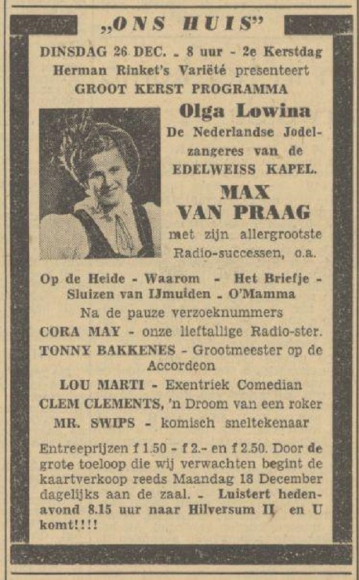 Oldenzaalsestraat schouwburg Ons Huis advertentie Tubantia 16-12-1950. Groot kerstprogramma met o.m. Olga Lowina.