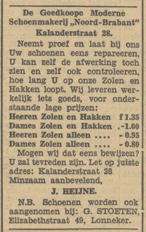 Kalanderstraat 28 J. Heijne schoenmakerijk Noord Brabant advertentie Tubantia 9-5-1933.