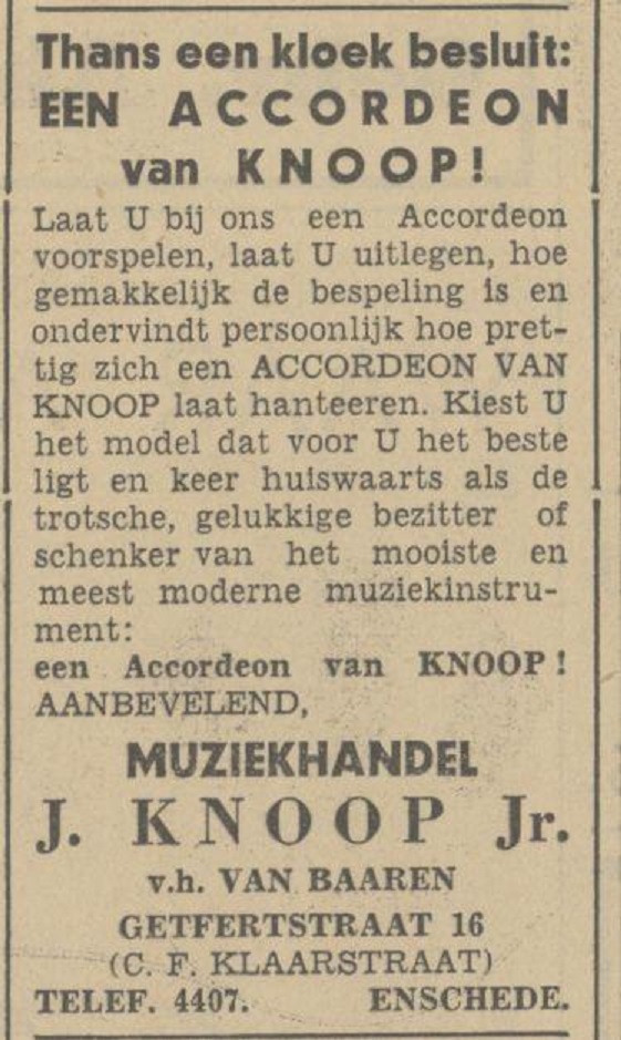 Getfertstraat 16 voorheen Van Baaren's Muziekhandel J. Knoop Jr. advertentie Tubantia 14-12-1932.jpg