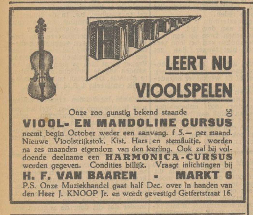 Markt 6 Muziekhandek H.F. van Baaren advertentie Tubantia 15-9-1935. Later muziekhandel Knoop aan de Getfertstraat (zie hiervoor)