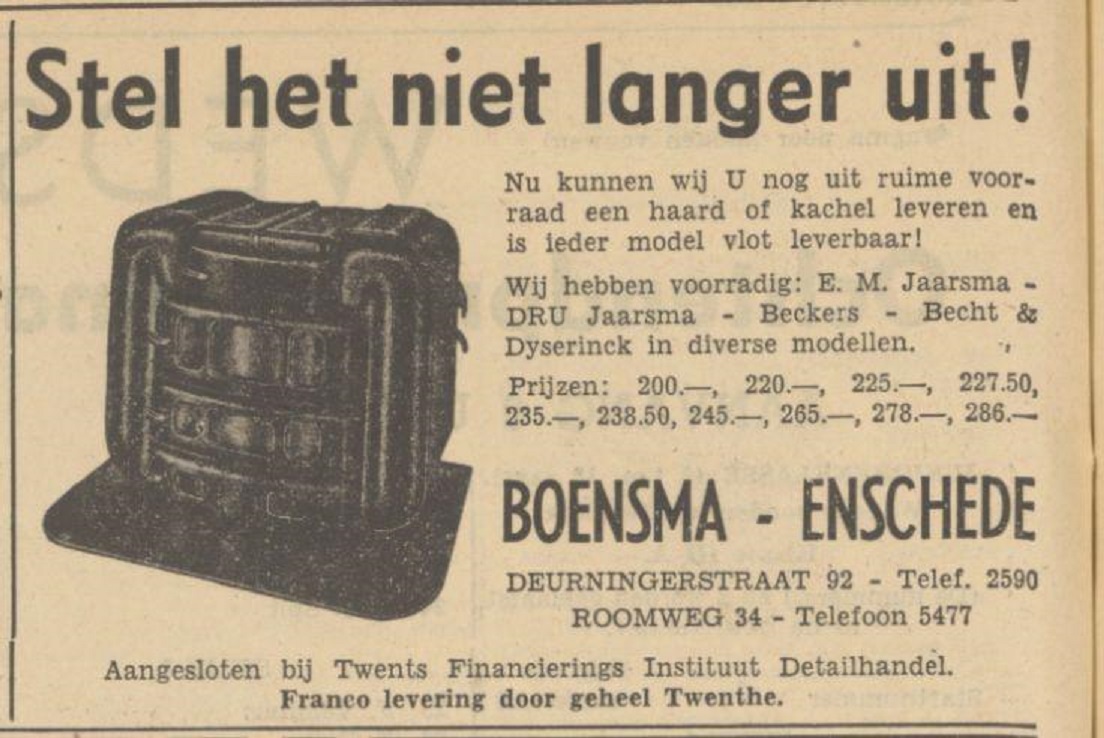 Deurningerstraat 92 Roomweg 34 Boensma advertentie Tubantia 10-8-1950.