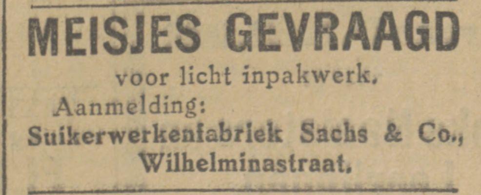 Wilhelminastraat Suikerwarkenfabriek Sachs & Co advertentie Tubantia 28-4-1927.