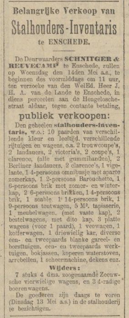 Hengelosestraat Stalhouderij Van De Lande advertentie Provinciale Overjsselsche en Zwolsche Courant 10-5-1919.