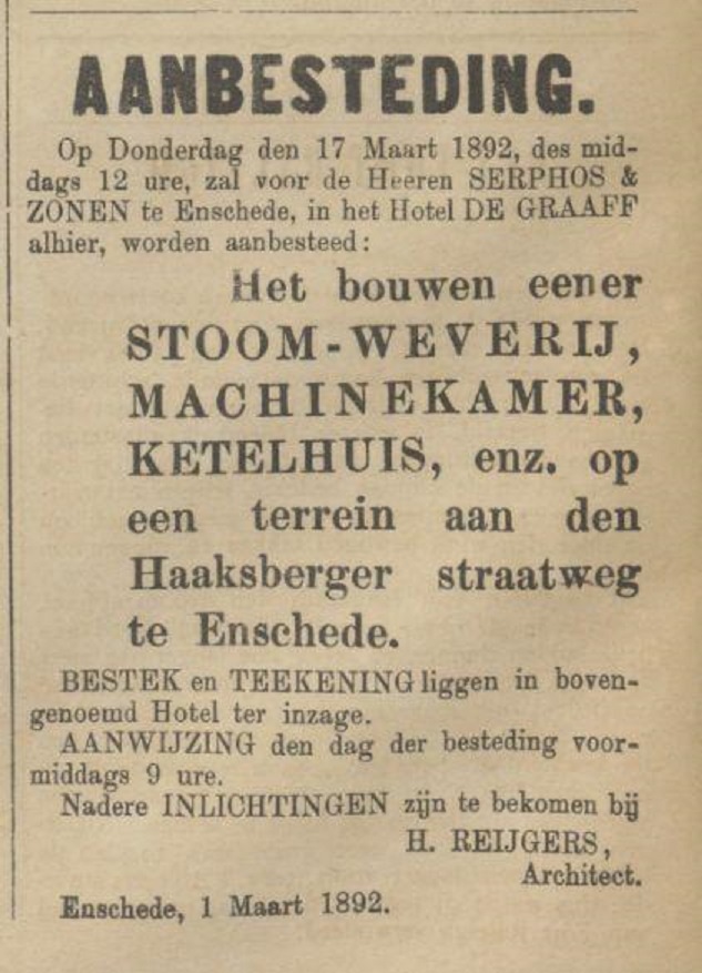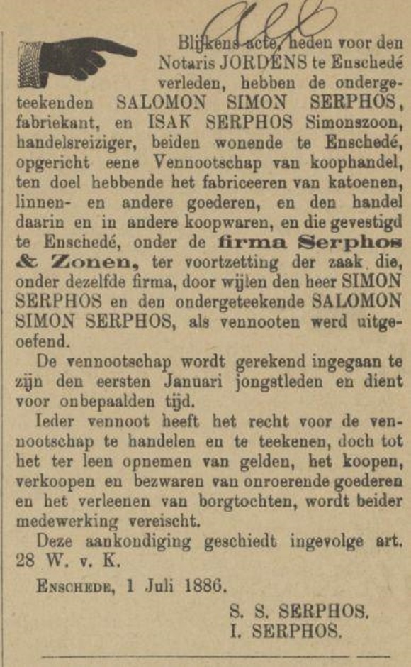 Firma Serphos & Zonen advertentie Tubantia 3-7-1886 en Haaksberger straatweg Serphos & Zonen advertentie Tubantia 16-3-1892.