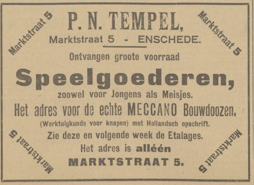 P.N. Tempel aan de Marktstraat 5 was een speelgoedwinkel volgens deze advertentie uit de Tubantia van 18-11-1924. In het pand aan de Marktstraat 5 heeft later ook nog het Infocentrum van de Gemeente Enschede gezeten. Nu zit aan de Marktstraat 5 een vestiging van La Stans Chocolatier & Patisserie.