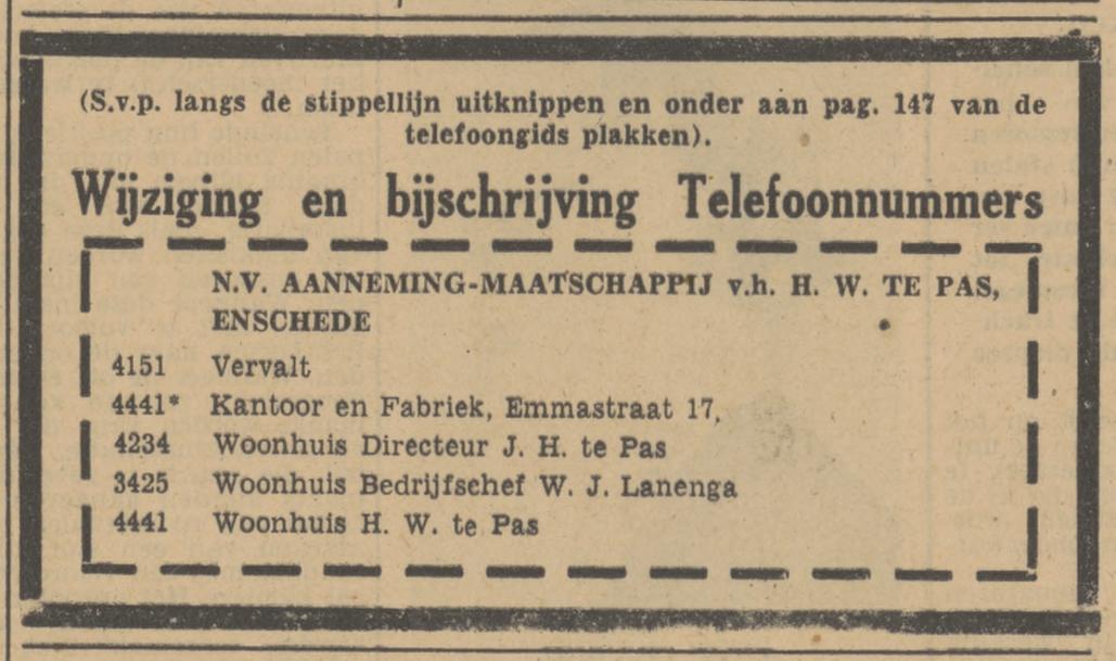 Aann.Mij v.h. H.W. te Pas N.V. Kant. en fabr., Emmastraat 17