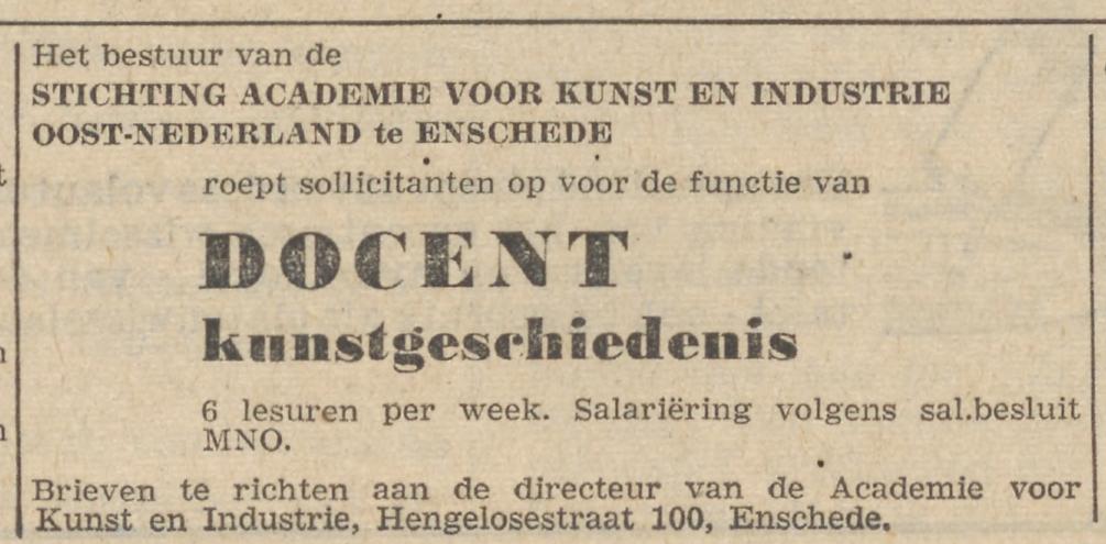 Academie voor Kunst en Ind. (middelb. School v. Kunst en Kunstnijverh. onderwijs), Hengelosestraat 110.
