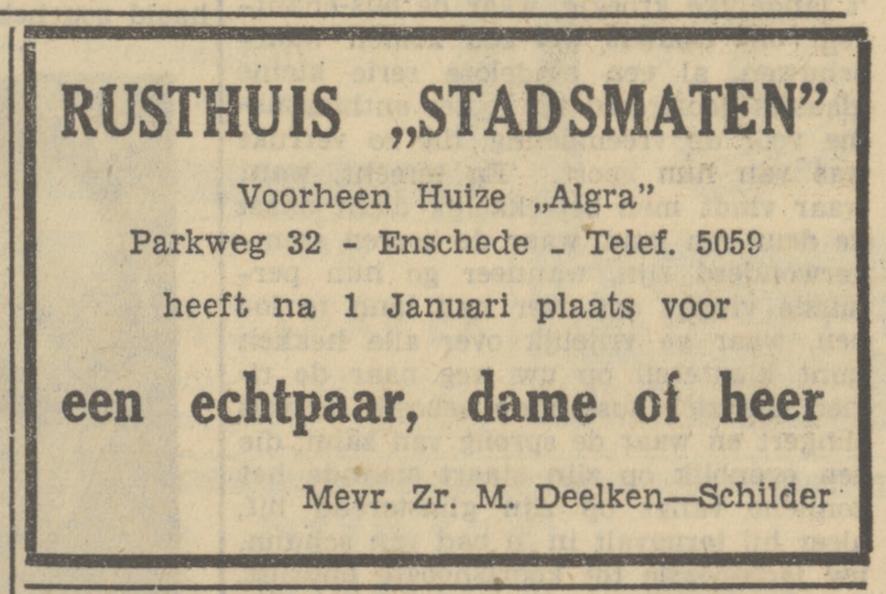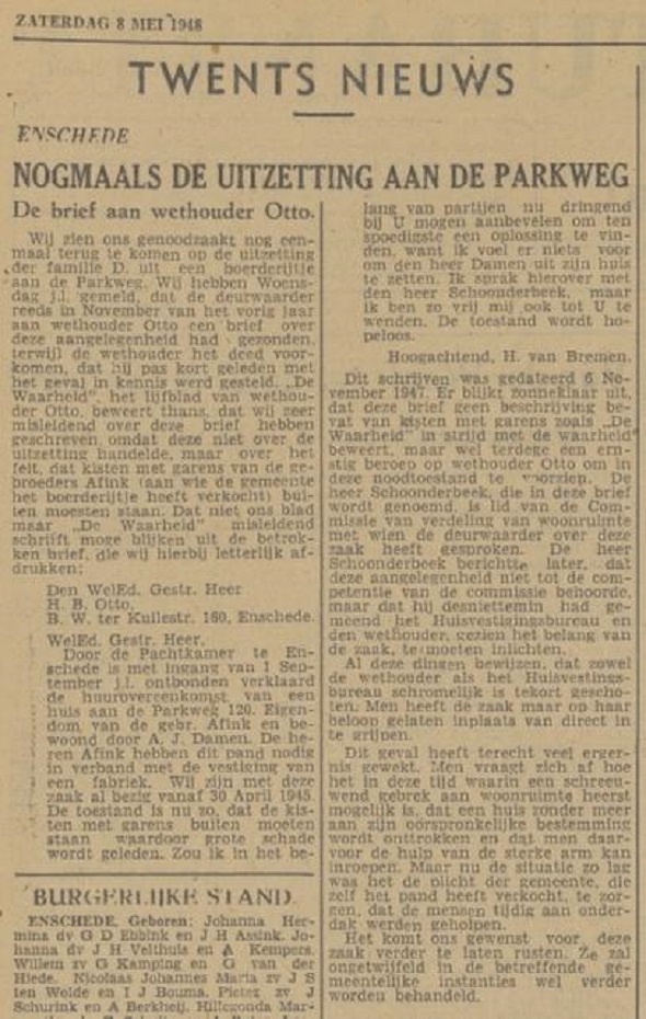 Ik heb van dit pand geen foto kunnen vinden. Aan de Parkweg 120 stond vroeger een boerderij van A.J. Damen. Deze moest worden gesloopt i.v.m. de vestiging van de machinefabriek van H.B. Afink. zie omderstaand krantenbericht uit de Tubantia van 8-5-1948.