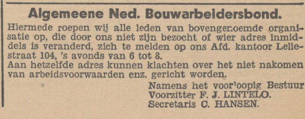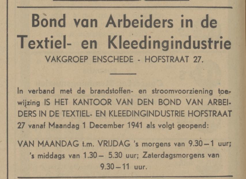 Alg. Ned. Bond v. Arb. en Arb.sters. i.d. Textiel en kleed bedr. De Eendracht Hofstraat 27.