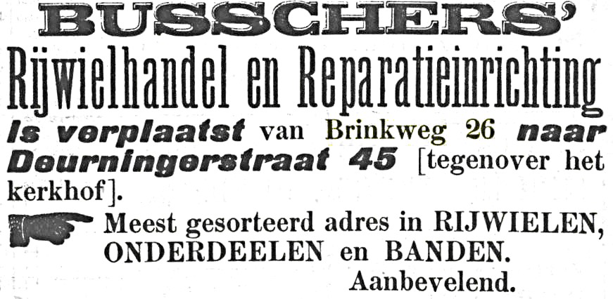 Busschers, kantoorbenodigdheden, Brinkweg 26, later rijwielzaak aan de Deurningerstraat. Overleden 1961 en de zaak is toen gestopt.