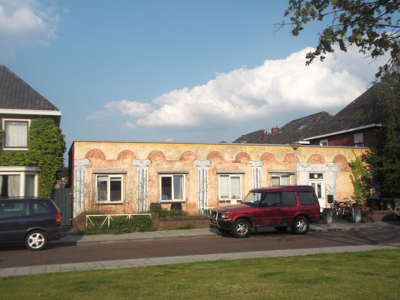 Die trapgevel Veteraan is van de oude School voor Nijverheid en Handel aan de beltstraat. Tussen de bomen zie je vaag het torentje van het Lyceum aan de C.F Klaarstraat. Links zie je de fabriek van Jannink. De pijp (die altijd warm aanvoelde) is net niet te zien. De Molenhuisjes zijn later verbouwd tot etalage's van meubelzaak De Zuidmolen.
