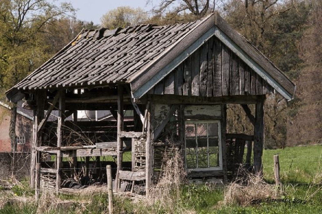 Het is een vakwerkschuurtje. De takjes zitten er nog, dus alleen wat leem het je kunt er wonen!