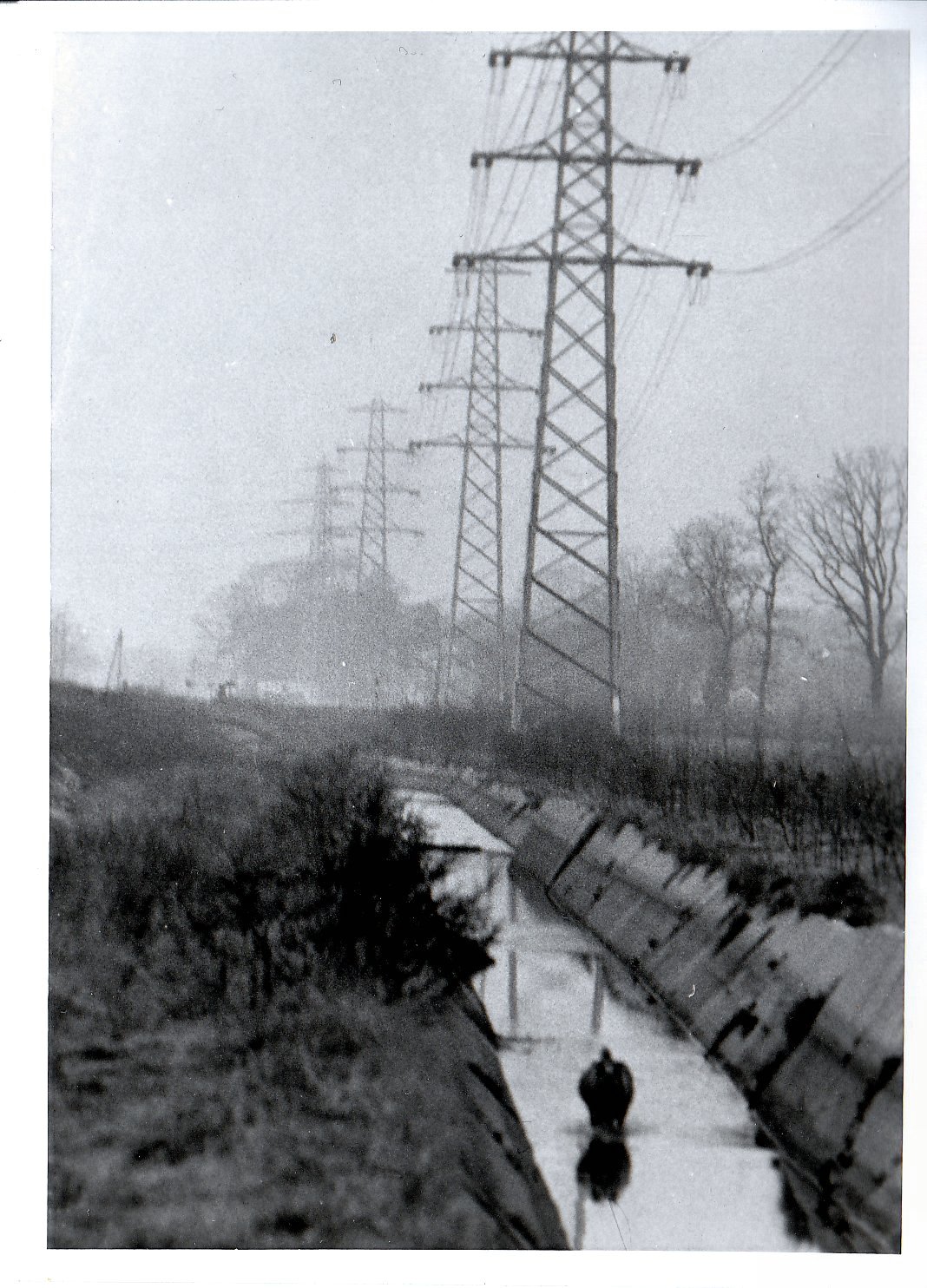 Tweede foto: de hoogspanningsmasten langs het afwateringskanaal. In het kanaal onze hond, dat stomme beest wist wel hoe er in te komen maar eruit? Vandaar dat mijn zus niet alleen ging, met haar witte jas aan :D