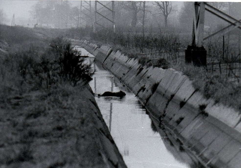 Ik heb de hint begrepen, mijn duikpak aangetrokken, rubberlaarzen eroverheen, oude monkeygrip rubber handschoenen aan, stratenmakers kniestukken over mijn knieën, riem van de hond mee, en ben door de tunnel gegaan. Niet iets om nog eens te doen, donker, vuil, glibberige bagger en ander ongevoeg, spinnen, beestjes, maar ja. Aan het eind de hond aan de lijn, en geprobeerd om die mee te trekken. Ugh. Die wilde niet. Met heel veel moeite en veel trekwerk heb ik ‘m een meter of twintig de tunnel in gekregen, en ineens had ie het in de gaten: we gaan naar huis. Vanaf dat moment was het makkelijk. Aan de kanaalkant stond mijn vader, ik liet de hond los, die dook in het kanaal en kwam er op eigen kracht uitgeklommen. Ik ben voorzichtig over de houten afscherming gelopen, en daarna in het water gestapt: je kon me volgens mij drie weken geleden tegen de wind in ruiken. Thuis onder de tuinslang, duikpak uitgewassen, daarna onder de douche, opgelost.