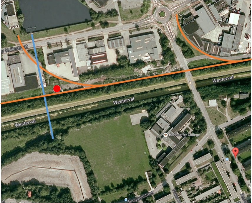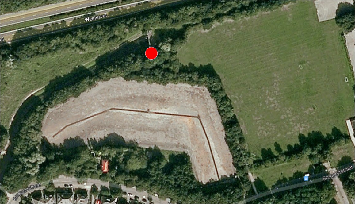 De rode punt is het punt van waaraf de foto’s ongeveer genomen zijn, en de blauwe lijn is het ondergrondse kanaal van de riool overstort naar het kanaal. In het kanaal zie je de betonning die dat overstortpunt markeert, een wittig U-vorming hek in het water.