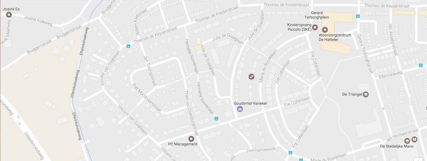 Volgens het straatnamenboekje van de Gemeente Enschede is de naam Adriaen van Ostadestraat en deze loopt van de Zwering, hoek Ferdinand Bolstraat, eerst in z.-, daarna in z.o.- en vervolgens weer in z.-richting tot de Frans Halsstraat.
