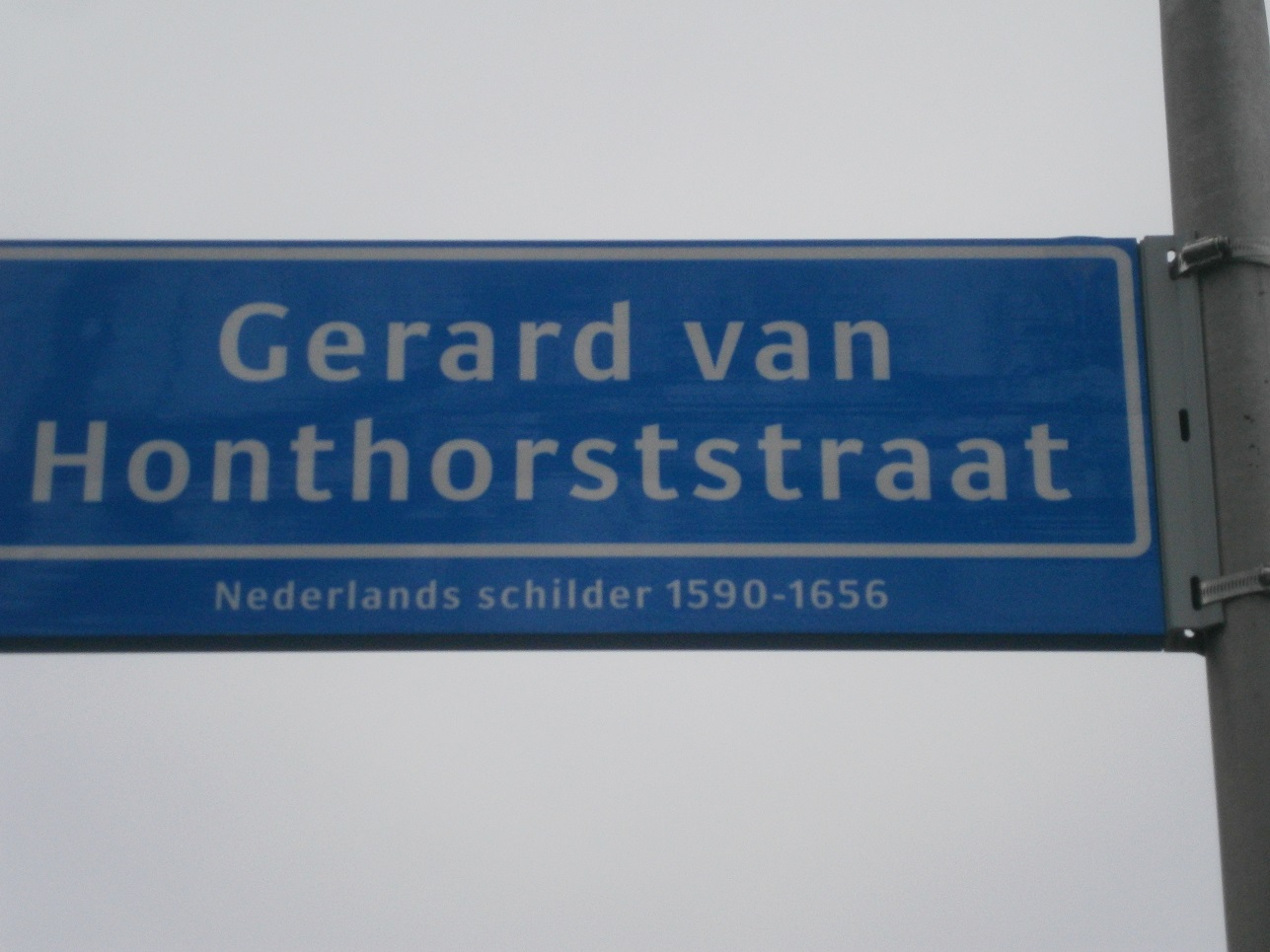 Naar Gerard van Honthorst, Ned. schilder, geboren 4 november 1590 te Utrecht, overleden 27 april 1656 aldaar. Schilderde portretten en genrestukken en was o.m. hofschilder van Frederik Hendrik en Willem II (12 november 1956). bron: http://straatnamen.enschede.nl/straten/01255/?char=G