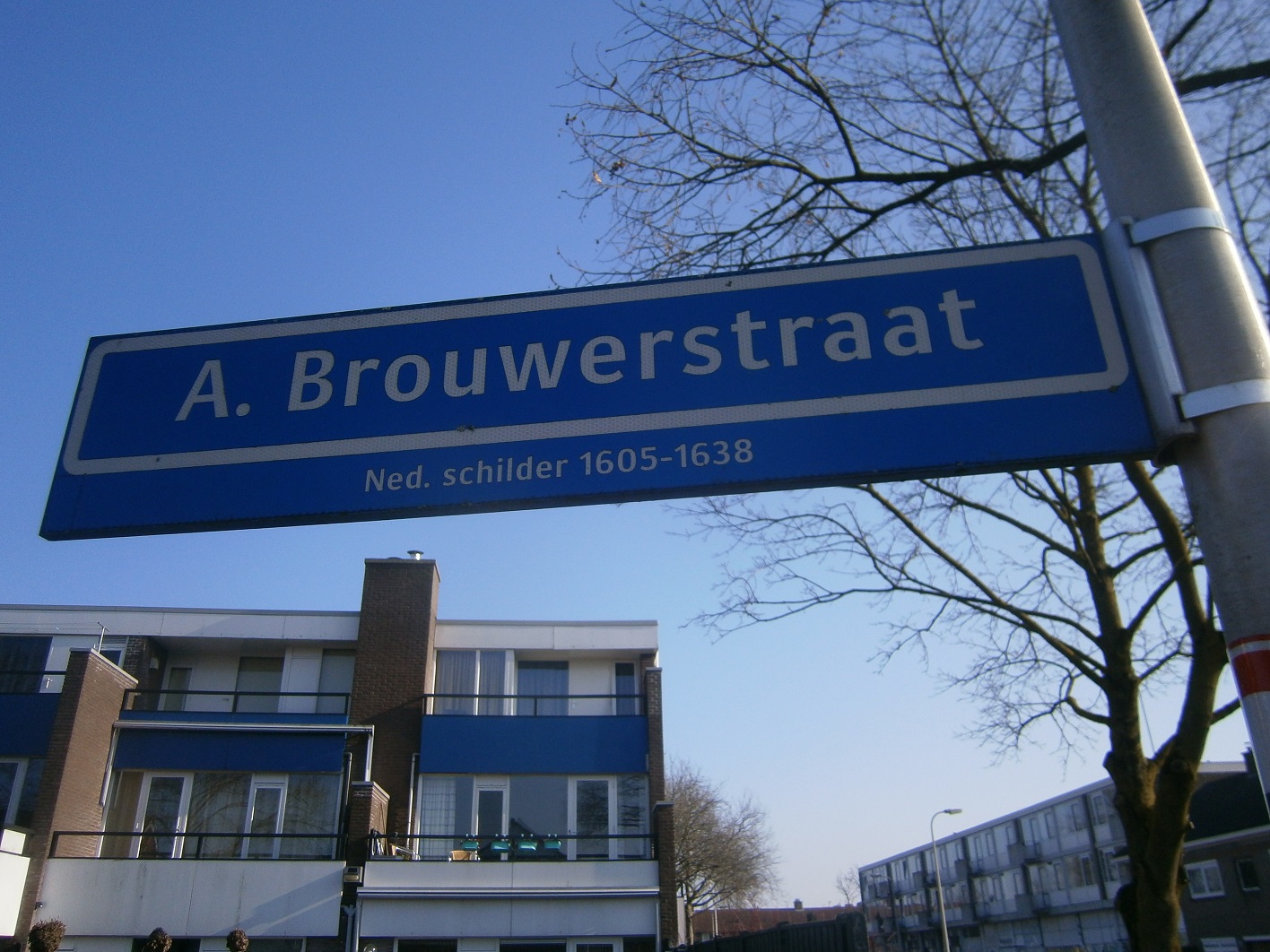 Naar Adriaen Brouwer, Vlaams schilder, geboren 1605 of 1606 te Oudenaarde, overleden 1638 te Antwerpen. Is vermaard geworden om zijn soms navrante kroegtaferelen en zijn landschappen (4 april 1955). bron: http://straatnamen.enschede.nl/straten/00151/?char=A