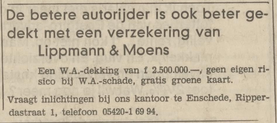Ripperdastraat 1 Lippmann & Moens verzekeringen advertentie Tubantia 10-11-1970