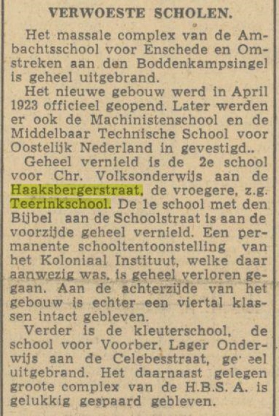 De Teerinkschool is bij het bombardement in feb. 1944 geheel verwoest. Zie ook nog het onderstaande gedeelte van het krantenbericht uit het Twentsch nieuwsblad van 24-2-1944.