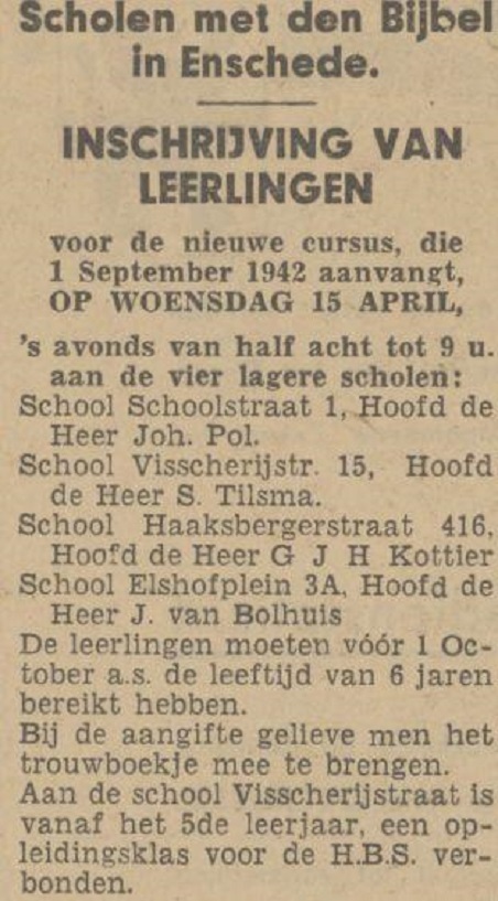 Volgens onderstaand krantenbericht uit de Tubantia van 11-4-1942 waren er destijds 4 scholen met de bijbel in Enschede, t.w. aan de Schoolstraat 1, Visserijstraat 15, Haaksbergerstraat 416 en Elshofplein 3A.
