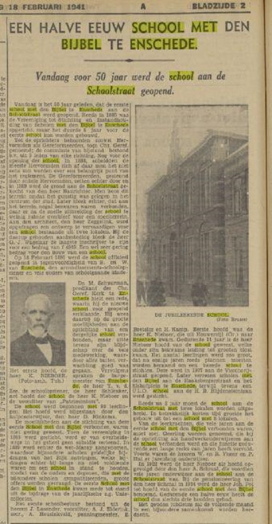 Vandaag foto's van de Eerste School met de Bijbel aan de Schoolstraat. Deze school werd daar in 1890 gebouwd en op 17-2-1891 in gebruik genomen. In 1941 bestond deze school dus een halve eeuw en hieraan is uitvoerig aandacht besteed in de Tubantia van 18-2-1941. Zie onderstaand krantenbericht.