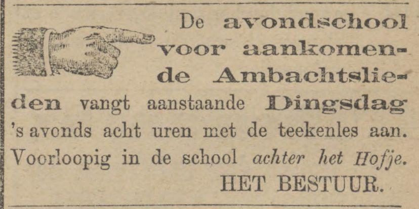Zie ook onderstaande krantenberichten waaruit blijkt dat in de school van de heer van Braam ook een Avondschool was voor aankomende Ambachtslieden.