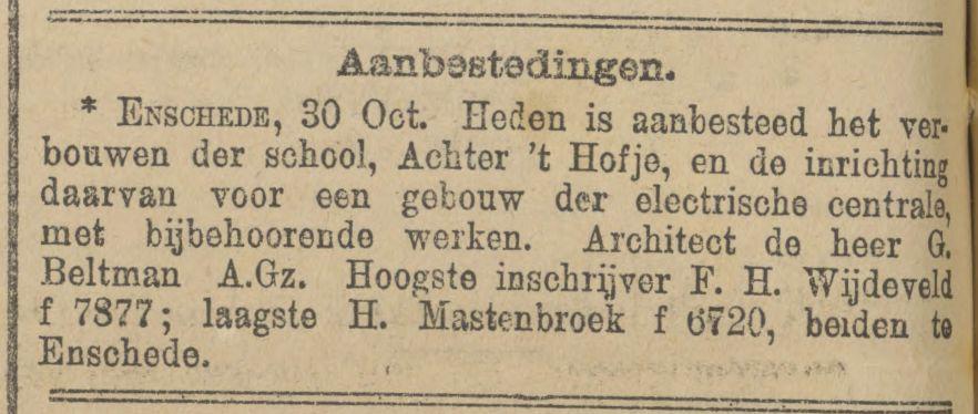 In het boek De Openbare Lagere en Kleuter Scholen in Enschede en Lonneker 1645-1985 van T. Wiegman wordt de Van Braamschool genoemd. Deze school stond tot 1896 in de de straat Achter het Hofje t.w. School 1, de Oude Stadsschool en vanaf 1886 de 2e Openbare Lagere School genoemd. Het Hoofd van deze school was de heer H. van Braam en werd dus ook wel Van Braamschool genoemd. In 1899 is dit schoolgebouw verbouwd voor een vestiging van een elektrisch centraal station voor de opwekking van stroom. De exploitatie voor electriciteit is op 9-4-1901 begonnen door de firma Hofstede Crull en Willink.